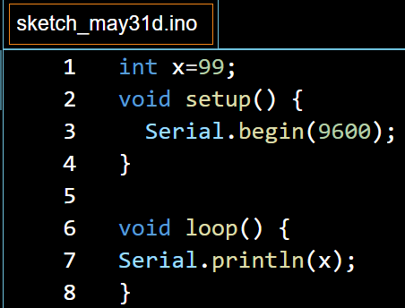 코드 예제 : x= 99를 통신 속도 9600 bps로 시리얼 모니터에 출력하는 코드