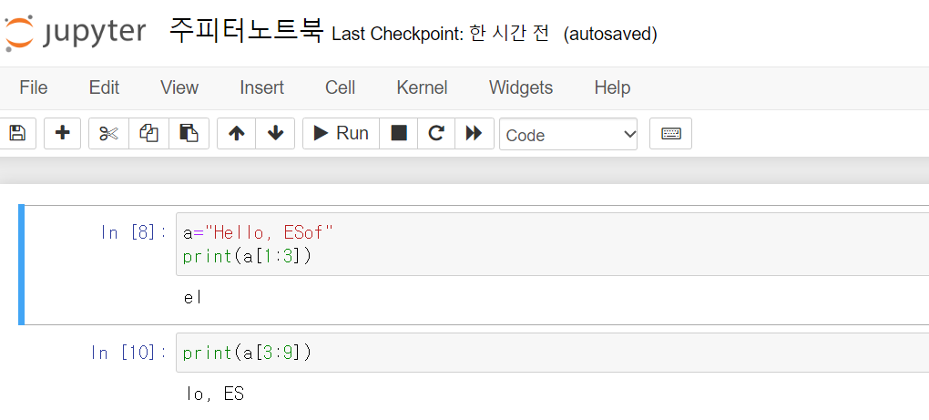 a 문자 변수에 문자열을 저장하고, [3:9] 3번째 문자에서 9번째 문자까지 출력하는 코드입니다.