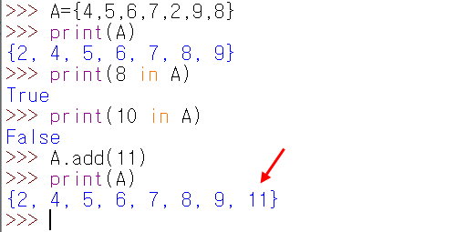 add() 함수를 이용하여, 집합에 원소를 추가 합니다.