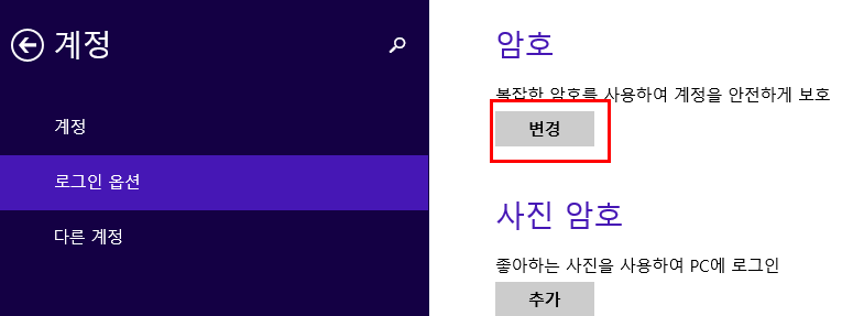 4. 왼쪽 로그인 옵션-->에서 암호 변경 버튼을 클릭합니다.